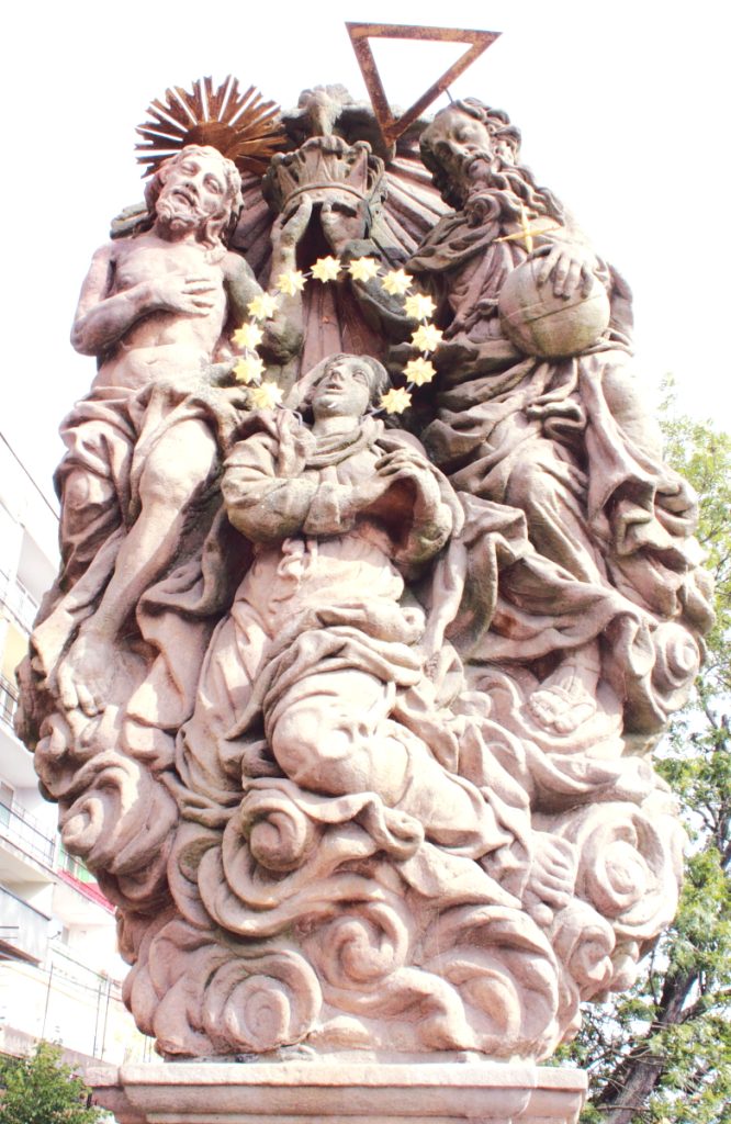 Św. Franciszek Ksawery, patron Kłodzka. To wotum za ochronę przed zarazą z lat 1713-14. Dlatego poniżej są przedstawienia trzech chorych. Tarczę z herbem Kłodzka trzyma Indianin.