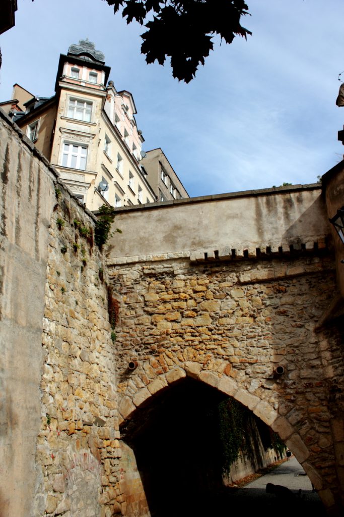 Średniowieczne mury miejskie, do których przylega most. Za nimi najstarsza część Kłodzka.
