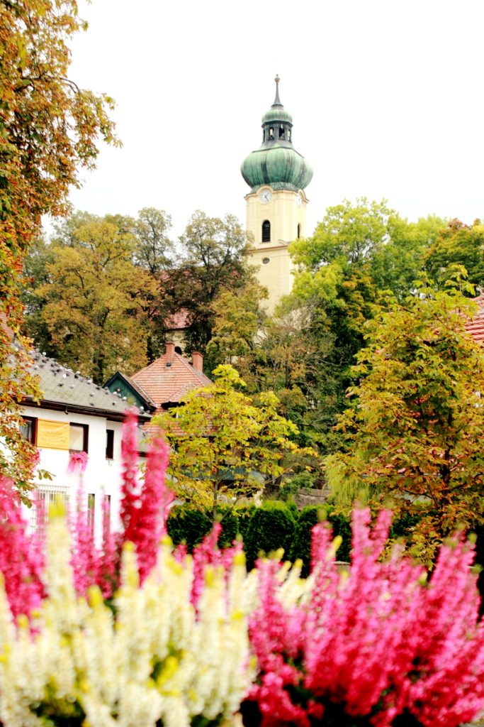 Widok zza kwitnących wrzosów na neobarokowy kościół z 1912 roku pw. Wniebowzięcia NMP.