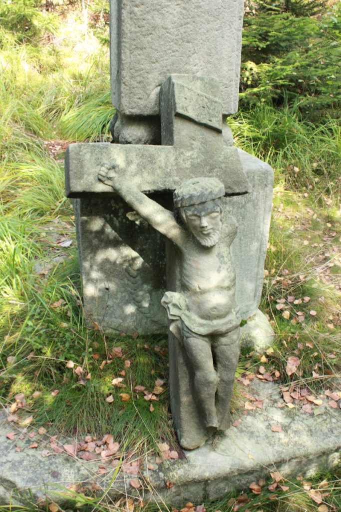 Przy ścieżce wśród paproci złamany kamienny krzyż.