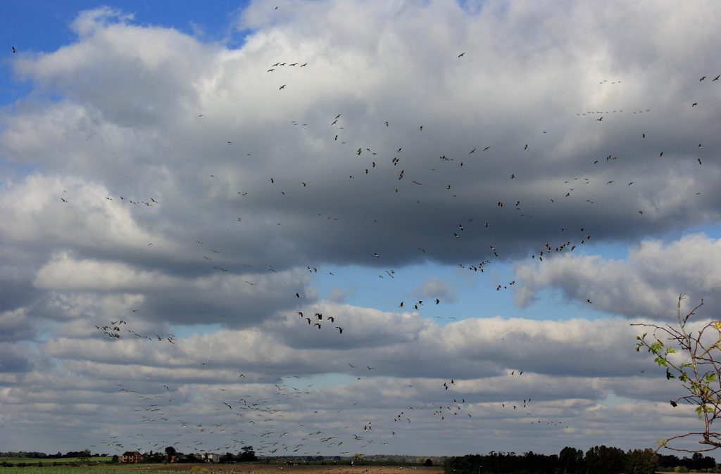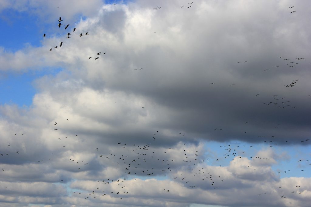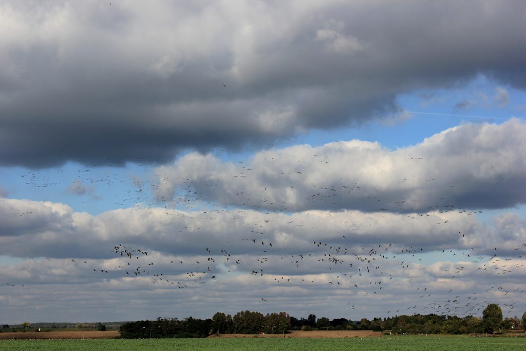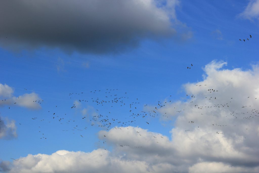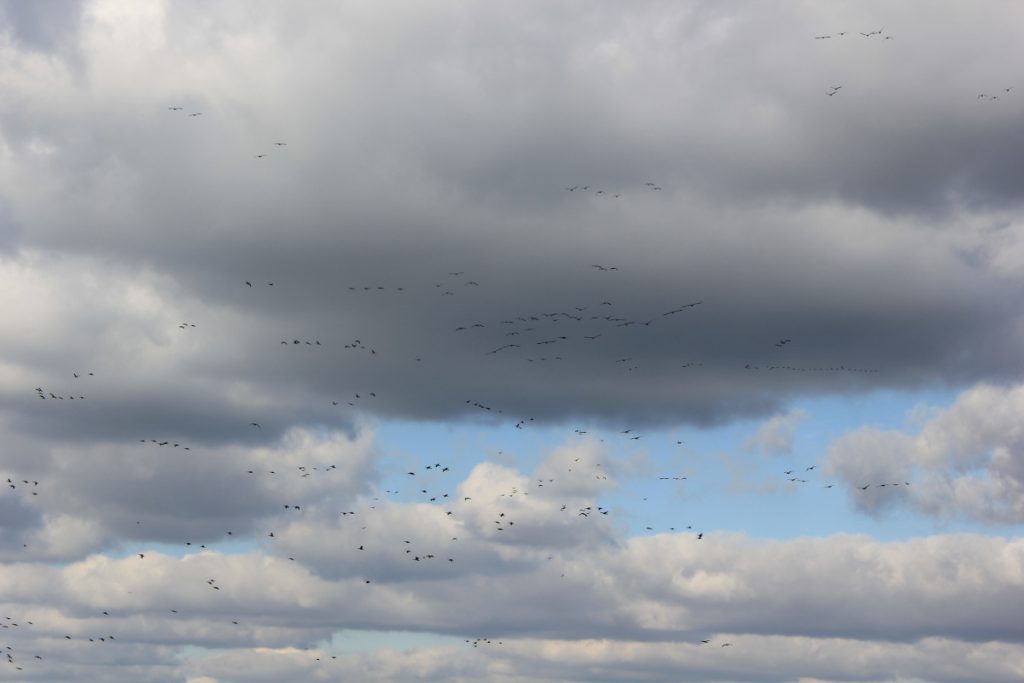 Najpierw było słychać wszechogarniający szmer, a potem coraz wyraźniejsze odgłosy. Wszystko to zlewało się w całość i zbliżało. Po chwili na niebie pojawiło się mnóstwo ptactwa. Wpierw „niewielkie” sylwetki na tle ogromnych chmur. Potem coraz ich więcej i więcej. To ogromne ilości lecącego ptactwa. Setki lub tysiące dużych ptaków w locie. Trochę to trwało aż w końcu zdecydowały się wylądować na okolicznych polach. Nie przeszkadzałem im stojąc na drodze zauroczony zjawiskiem, którego do tej pory nie widziałem. Jak osiadły na ziemi wśród zielonego zboża ozimego dochodziły pomieszane odgłosy ptasie.