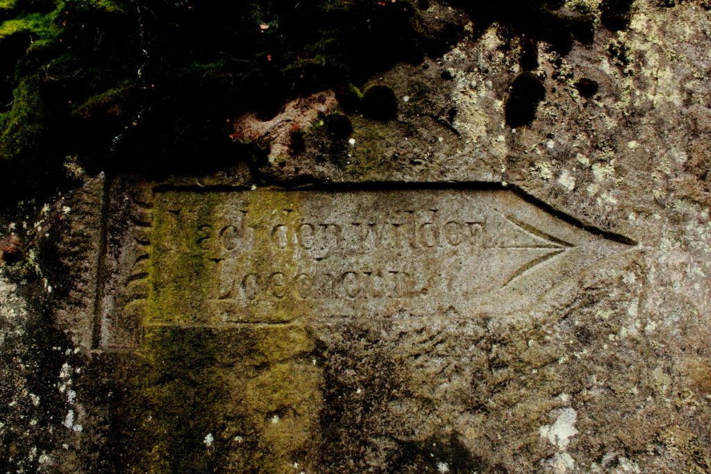 Równie zatarty jest ten stary napis w języku niemieckim sfotografowany niedaleko Pasterki. Z tego co zdołałem rozszyfrować w tłumaczeniu na język polski brzmi: ” Po dzikich…”