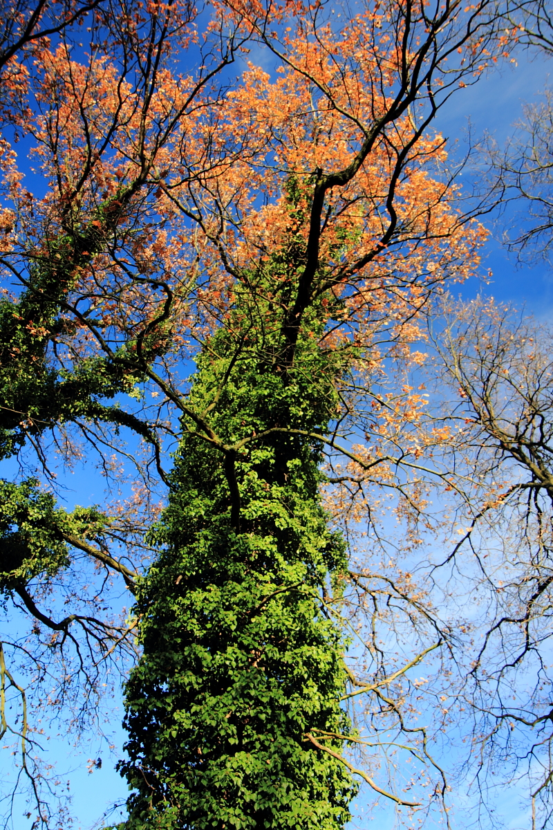 Zdjęcie tytułowe wykonałem w 2019 roku. W górnej partii tego wysokiego drzewa widać jeszcze pozostałości barwnej jesieni. Poniżej zimozielone pnącze bluszczu.