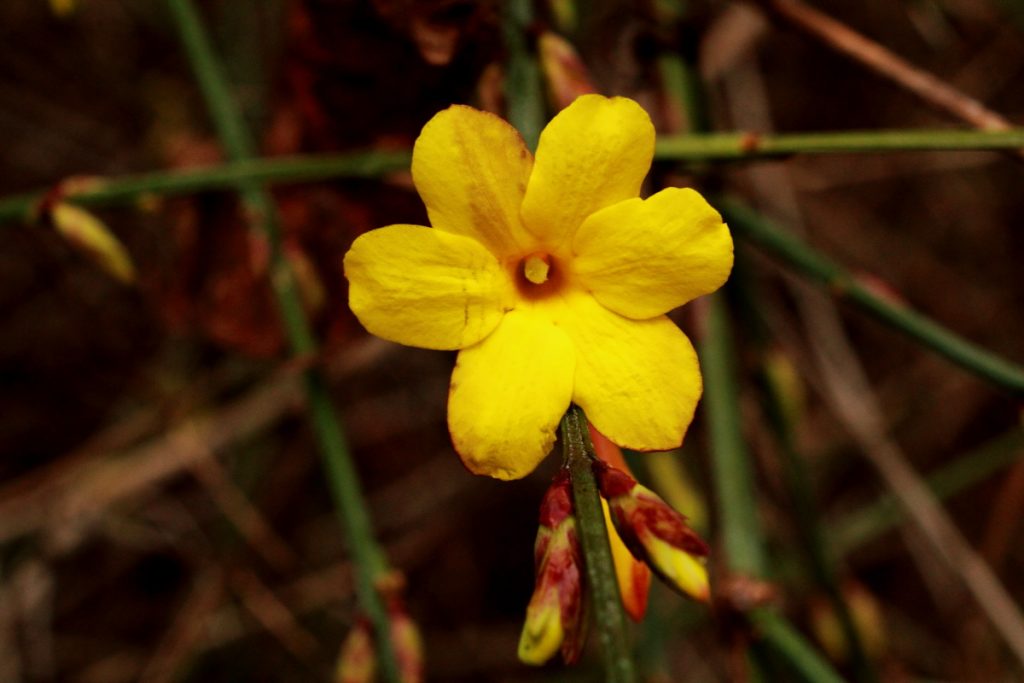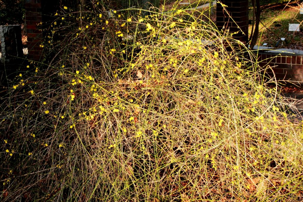 Kwitnący w zacisznym miejscu przy pergoli krzew jaśminu nagokwiatowego.