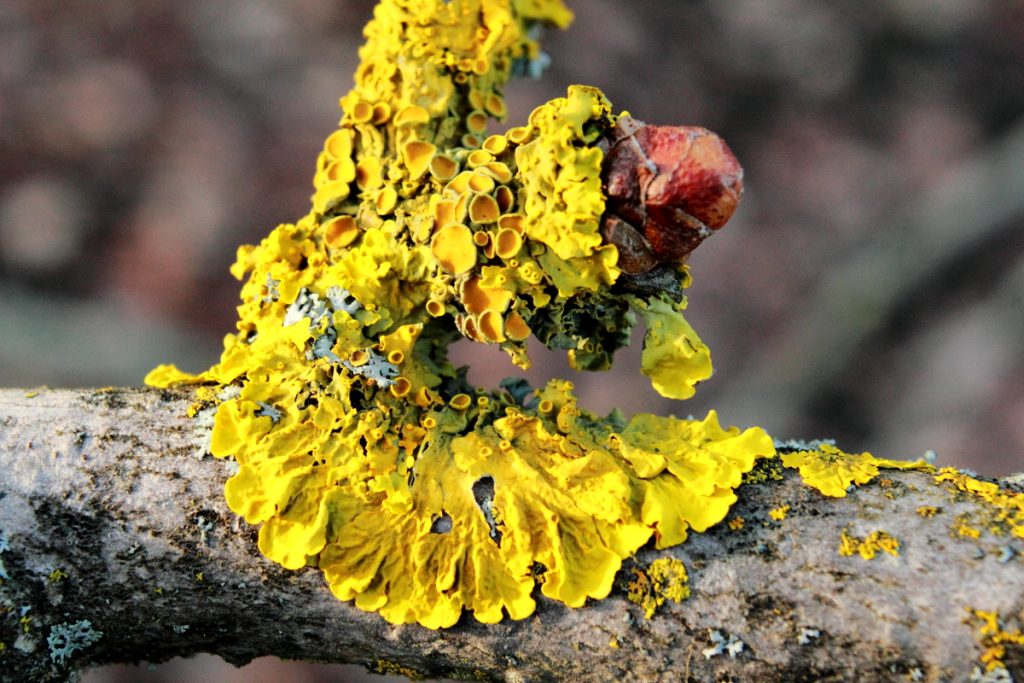 Na zdjęciu porosty wyrastające na gałązce miłorzębu dwuklapowego, nazywanego też roślinną skamieniałością.