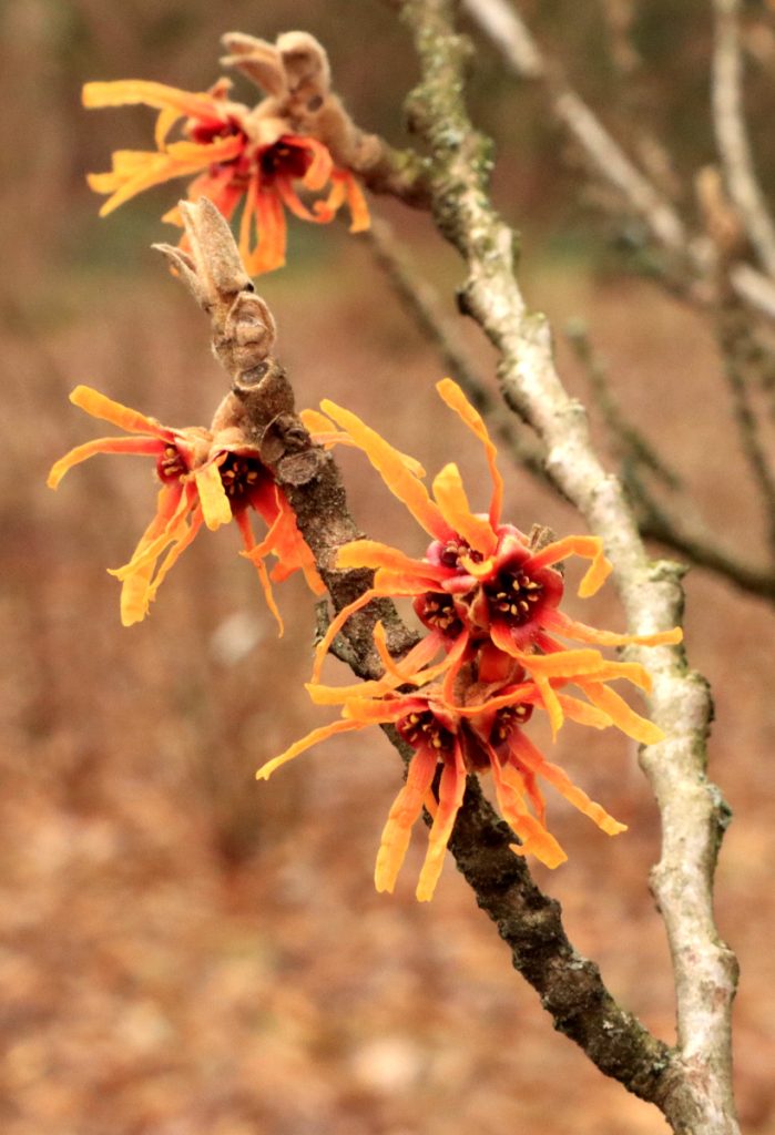 Oczar omszony. Kwiaty na bezlistnych gałązkach tego krzewu.