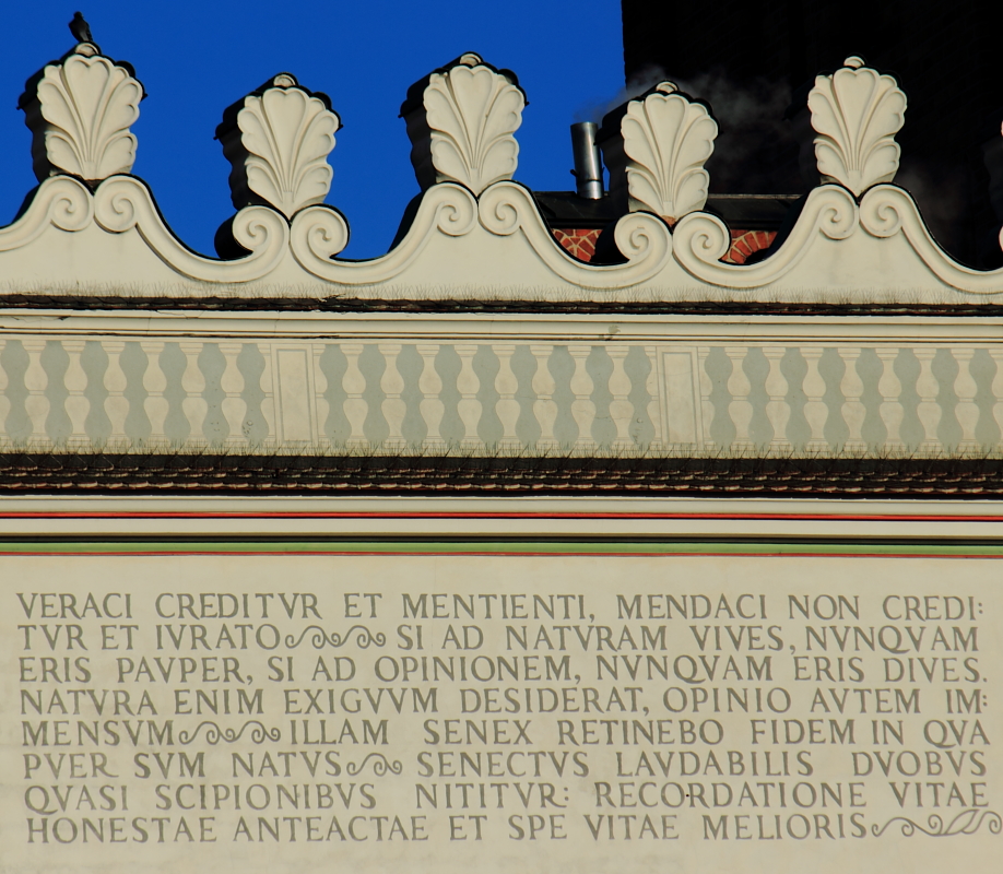 Na następnym zdjęciu zbliżenie innego fragmentu poznańskiego Ratusza. Widać na nim łacińskie napisy, które przypominają o dawnej historii miasta.