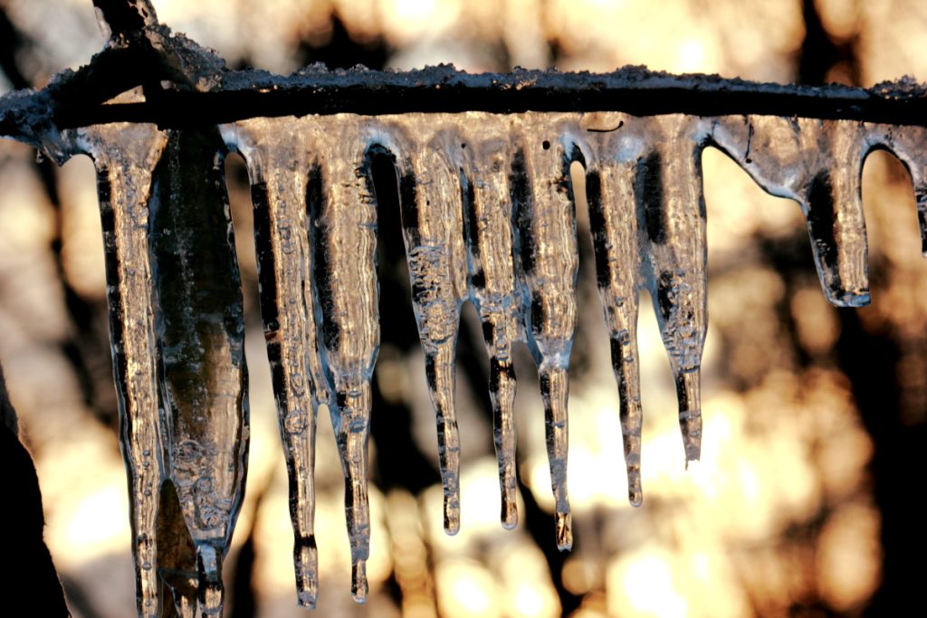Sople lodowe sfotografowane w czasie zachodu słońca przy wietrznej pogodzie.