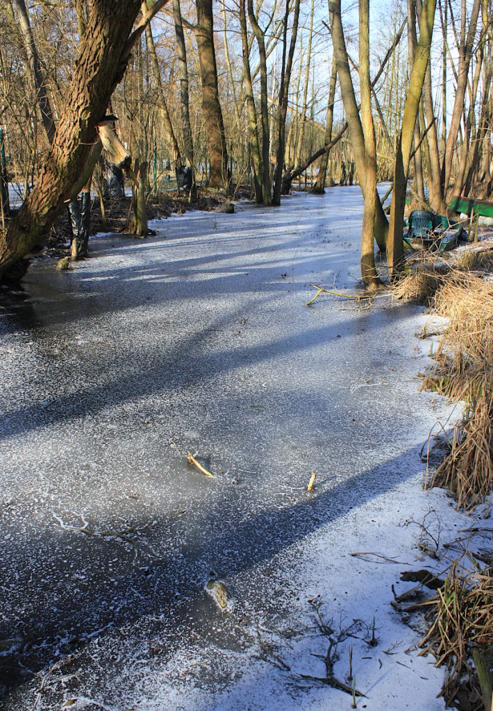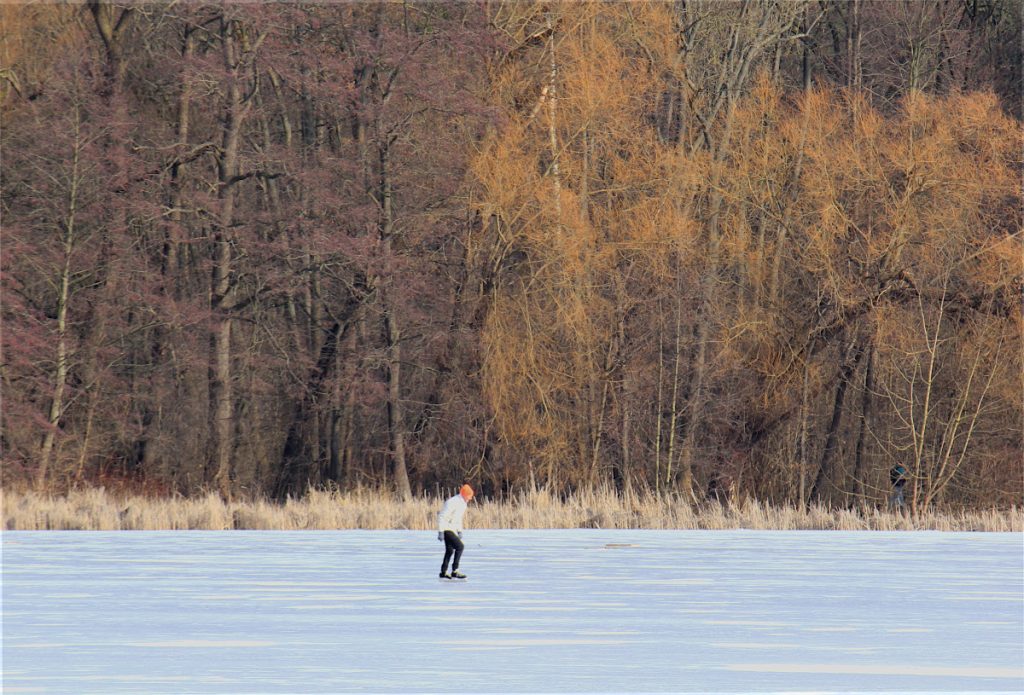 Druga część lutego 2026 r. na razie mroźna. Wiedząc o prognozach pogody, że za kilka dni ma się ocieplić, póki co postanowiłem skorzystać z twardej zmrożonej trasy ze Strzeszynka do Ogrodów. To leśna i jeziorna część Poznania. Szlak turystyczny biegnie tam przy rzeczce Bogdance. Jego śliskie fragmenty w zimie nie zachęcają do wycieczek. Za to widoki przednie, bo nie ma zieleni. Zamarznięte jeziora, stawy i częściowo rzeczka bieleją kontrastując z otoczeniem. Jeziora całkiem zamarznięte. Sporo wędkarzy łowiących w przeręblach. Po J. Rusałka szusowali łyżwiarze.