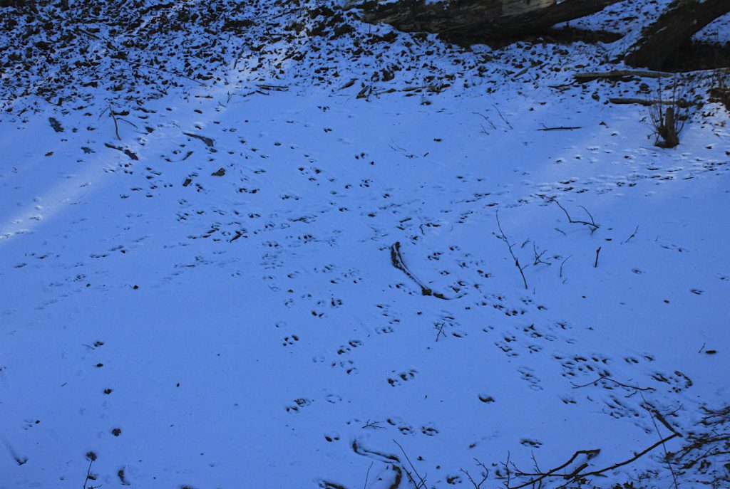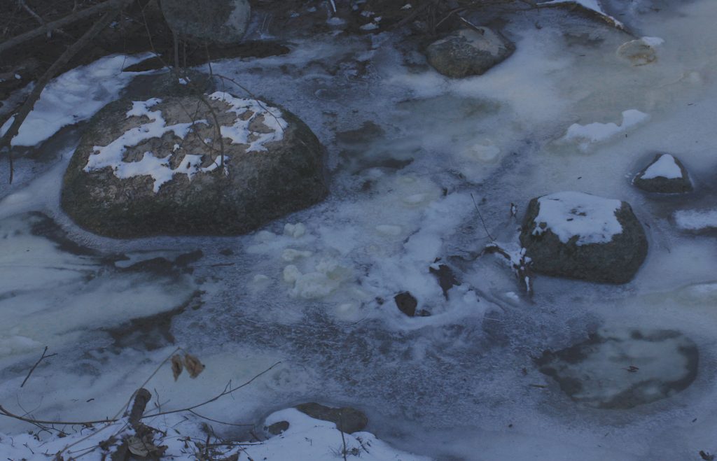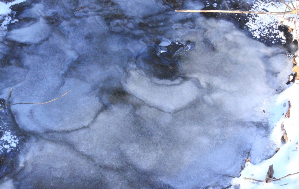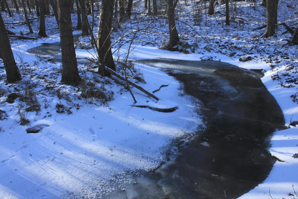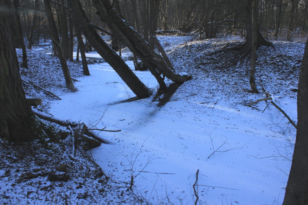 Teraz na niej wiele lodu. Prawie cała jest przykryta lodową skorupą. Pod lodem pluska przepływająca woda. Tu i tam na powierzchni zalodzenia rzeczki można znaleźć tropy dzikich zwierząt oraz psów. Na niektórych odcinkach Młynówki widać „przerwy” w lodzie, tam gdzie nurt jest bardziej energiczny, albo przed tamami bobrowymi.