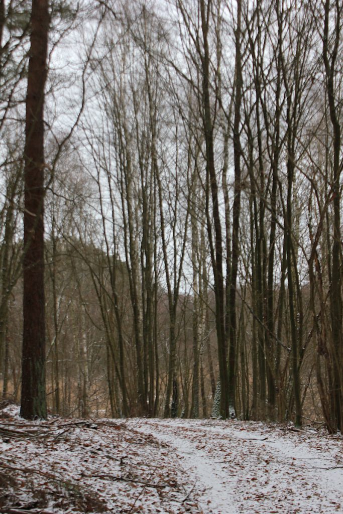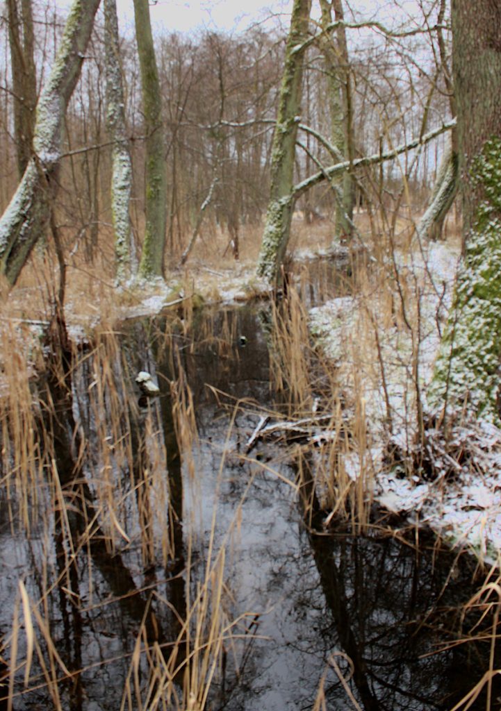 My jednak poszliśmy inaczej, dookoła jeziora Sarbia. Mróz, a drogi, dróżki oraz ścieżki były dobre do przejścia. Czyli dobre warunki na zimową wycieczkę leśną. Jezioro niemal całe zamarznięte, jak widać na zdjęciu tytułowym.