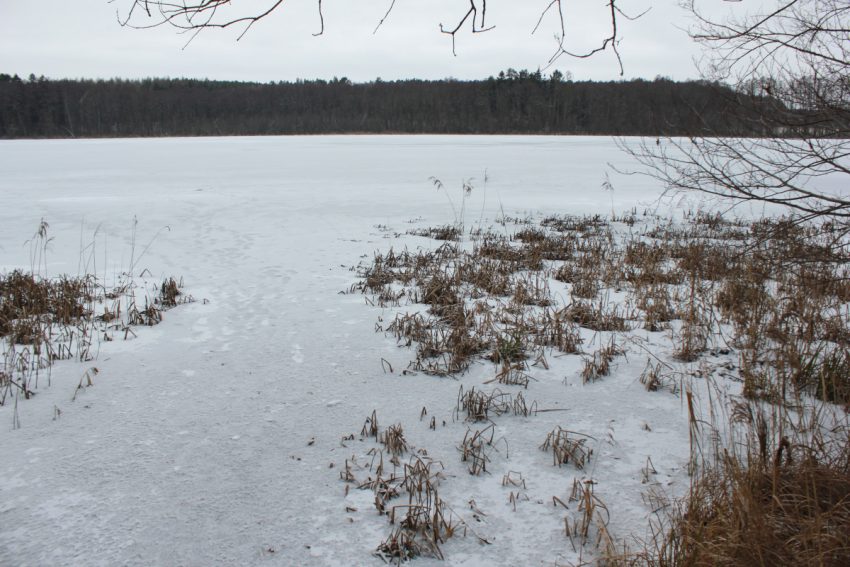 My jednak poszliśmy inaczej, dookoła jeziora Sarbia. Mróz, a drogi, dróżki oraz ścieżki były dobre do przejścia. Czyli dobre warunki na zimową wycieczkę leśną. Jezioro niemal całe zamarznięte, jak widać na zdjęciu tytułowym.