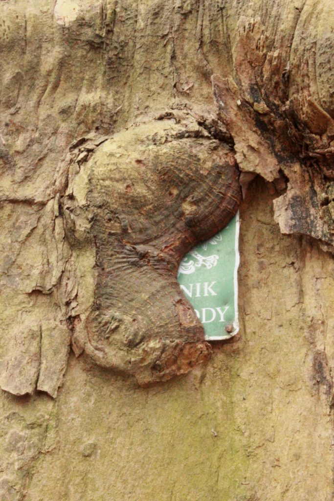 Tabliczka z napisem przez lata została prawie zarośnięta przez to drzewo.