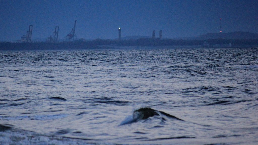 Po zachodzie słońca. Widok na oddalone o kilkanaście kilometrów Świnoujście (światło najwyższej na naszym wybrzeżu latarni morskiej, a w otoczeniu dźwigi portowe).