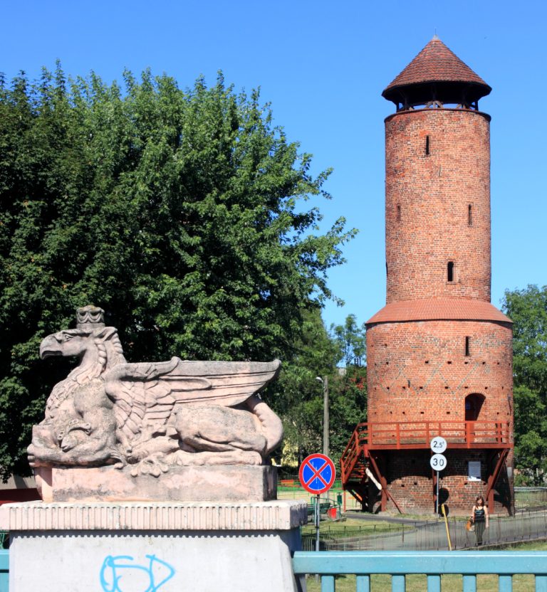 Na tytułowym zdjęciu widać rzeźbę gryfa, czyli mitycznego zwierzęcia o ciele lwa, z głową i skrzydłami orła. Pierwsze przedstawienia gryfa pochodzą z Mezopotamii, są sprzed 5 tysięcy lat. Na dalszym planie średniowieczna Baszta Prochowa, wzniesiona na przełomie XIII i XIV wieku. Fotkę tę wykonałem z mostu na rzece Redze w Gryficach, zachodniopomorskie. Gryf jest symbolem…